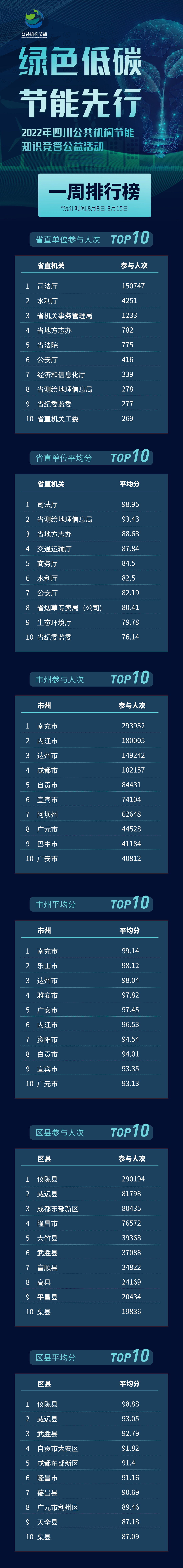 8月15日,由省机关事务管理局主办,省节能协会、川观新闻协办的“绿色低碳,节能先行”2022年四川公共机构节能知识竞答公益活动第五周的各项数据和排名出炉。