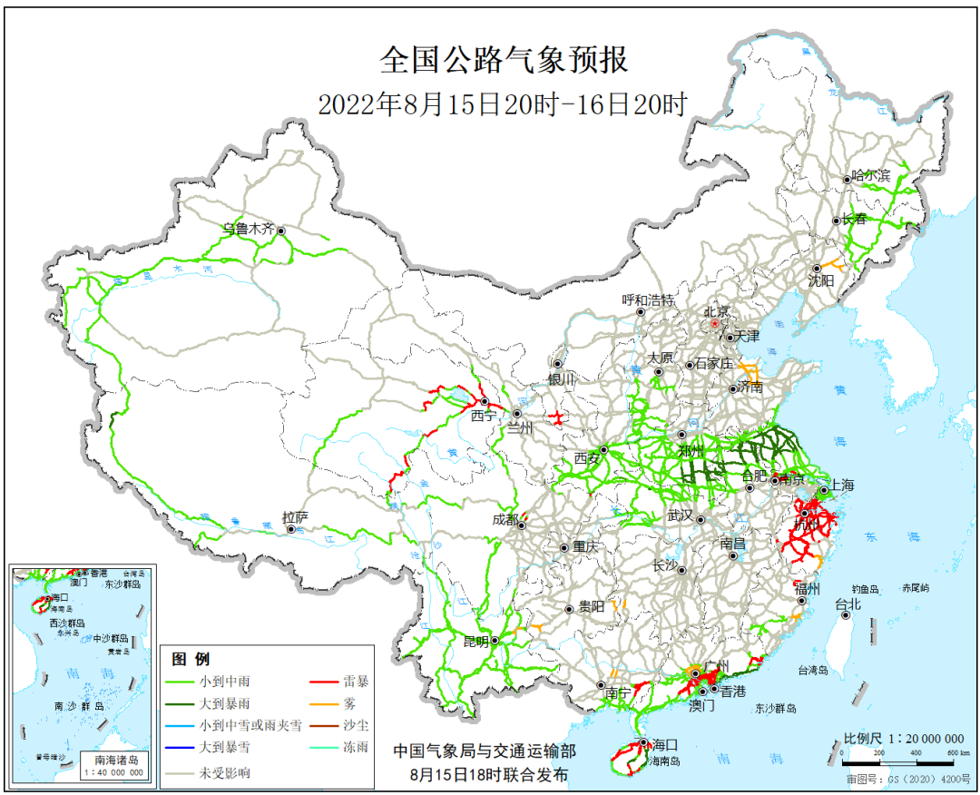8月15日20时至16日20时,河南南部、安徽北部、江苏北部、湖北西北部、广东南部、海南岛大部、云南南部、西藏西部等地的部分地区有中到大雨,其中,河南南部、安徽北部、江苏北部等地部分地区有暴雨。江苏西部、浙江大部、福建东北部、广东南部、广西东南部、海南岛、青海东北部和中部、宁夏南部等地局地有雷暴。另外,辽宁北部、浙江东南部、福建东部、山东北部、湖南西部、广东中部、广西中部、贵州南部、云南东北部等地局地有雾。