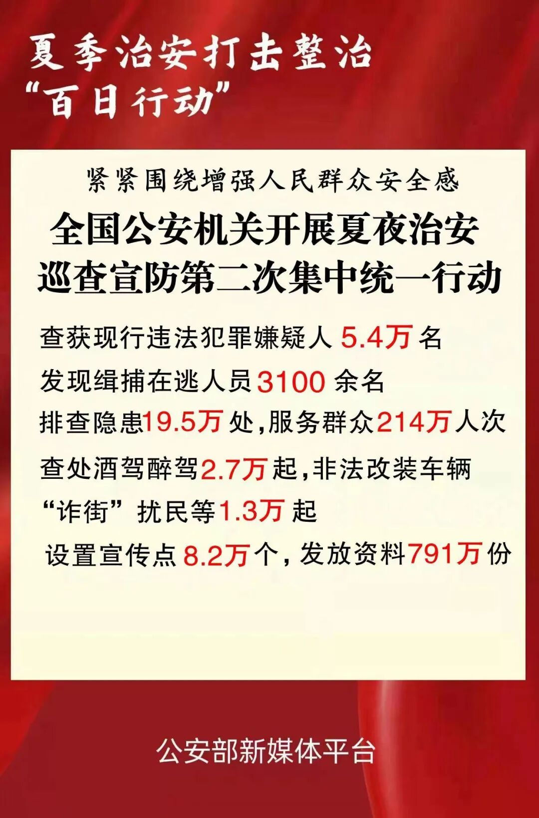 按照公安部统一部署,8月12至14日连续3个晚上的20时至次日凌晨2时,全国公安机关紧紧围绕增强人民群众安全感,组织开展夏夜治安巡查宣防第二次集中统一行动。行动期间,各地公安机关累计出动民警、辅警350万人次,发动群防群治力量542万人次,查获现行违法犯罪嫌疑人5.4万名,发现缉捕在逃人员3100余名,排查整改安全隐患19.5万处,服务群众214万人次,真正让人民群众感受到安全触手可及、就在身边。