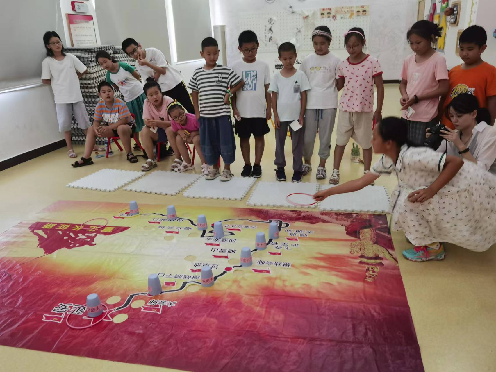 本次活动共分为重走长征路、红色故事会、毛氏六段操以及普通话小课堂4个主题。重走长征路先通过一段视频播放向社区青少年儿童讲述长征故事;之后采取“套圈”的形式在长征轨迹图案上行走,引导社区青少年儿童在游戏中追寻红色记忆,了解长征路线;随后采用分组形势让孩子们记忆长征路线图,该游戏难度相对较大,同学们经过多次失败后才走到长征的终点站,体验红军长征的胜利来之不易。