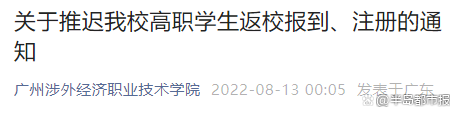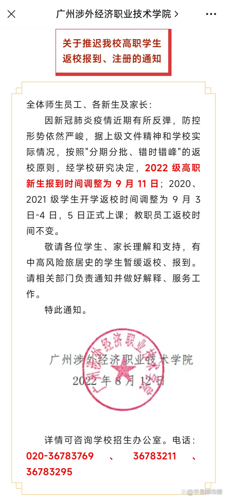 因新冠肺炎疫情近期有所反弹,防控形势依然严峻,据上级文件精神和学校实际情况,按照"分期分批、错时错峰"的返校原则,经学校研究决定,2022 级高职新生报到时间调整为 9 月 11 日;2020、2021 级学生开学返校时间调整为 9 月 3 日-4 日,5 日正式上课;教职员工返校时间不变。