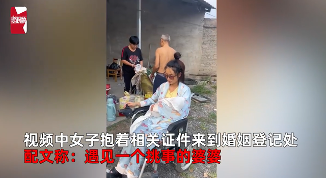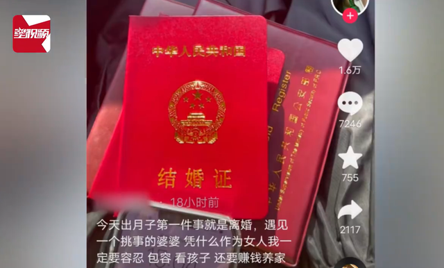 视频中女子抱着相关证件来到婚姻登记处,配文称:遇见一个挑事的婆婆,凭什么作为女人的我一定要容忍、包容、看孩子、还要挣钱养家。