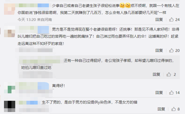 对此网友议论纷纷:“婆婆挑事不怕,就怕老公不按事,还躲事”、“现在还重男轻女?”