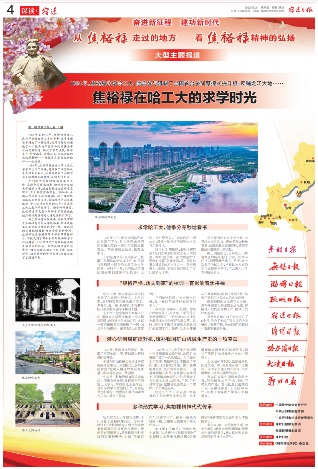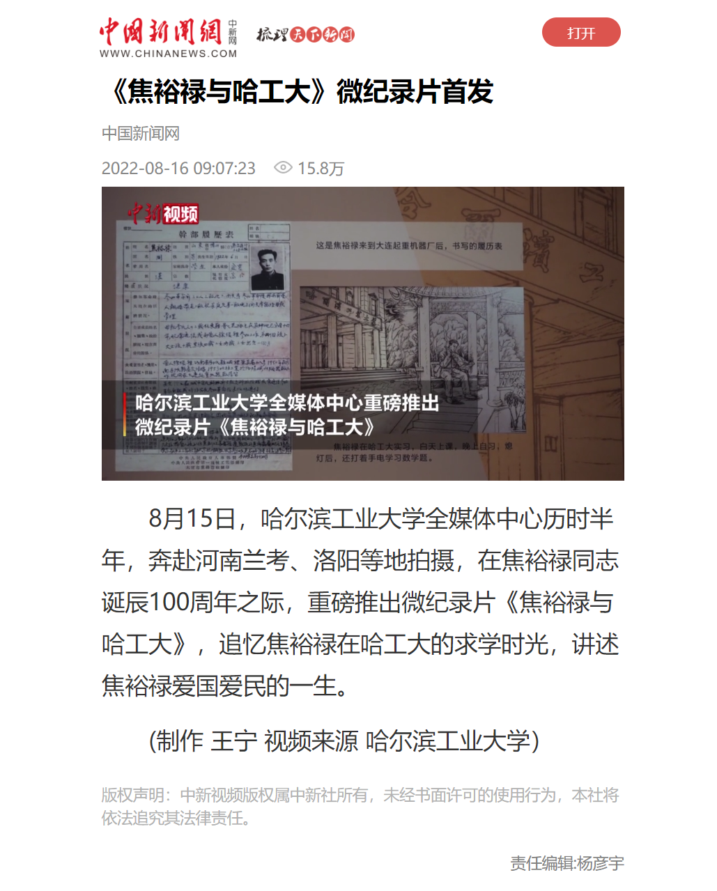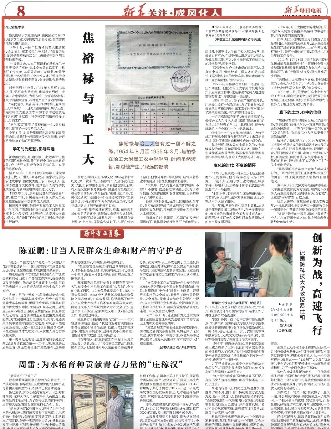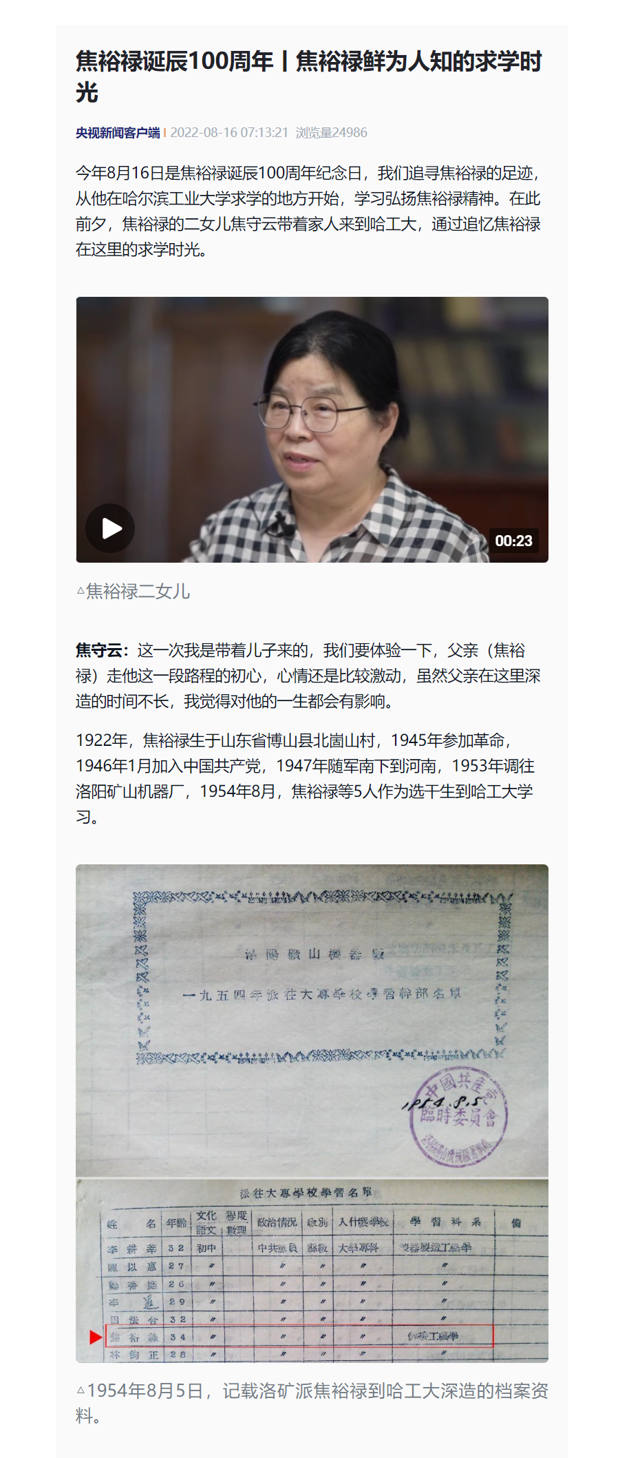 “尽管父亲在哈工大求学的时间不长,只有6个多月,但学校对工程人才的培养模式,以及科学求实的精神态度、精益求精的作风一直影响着他。”焦守云说。