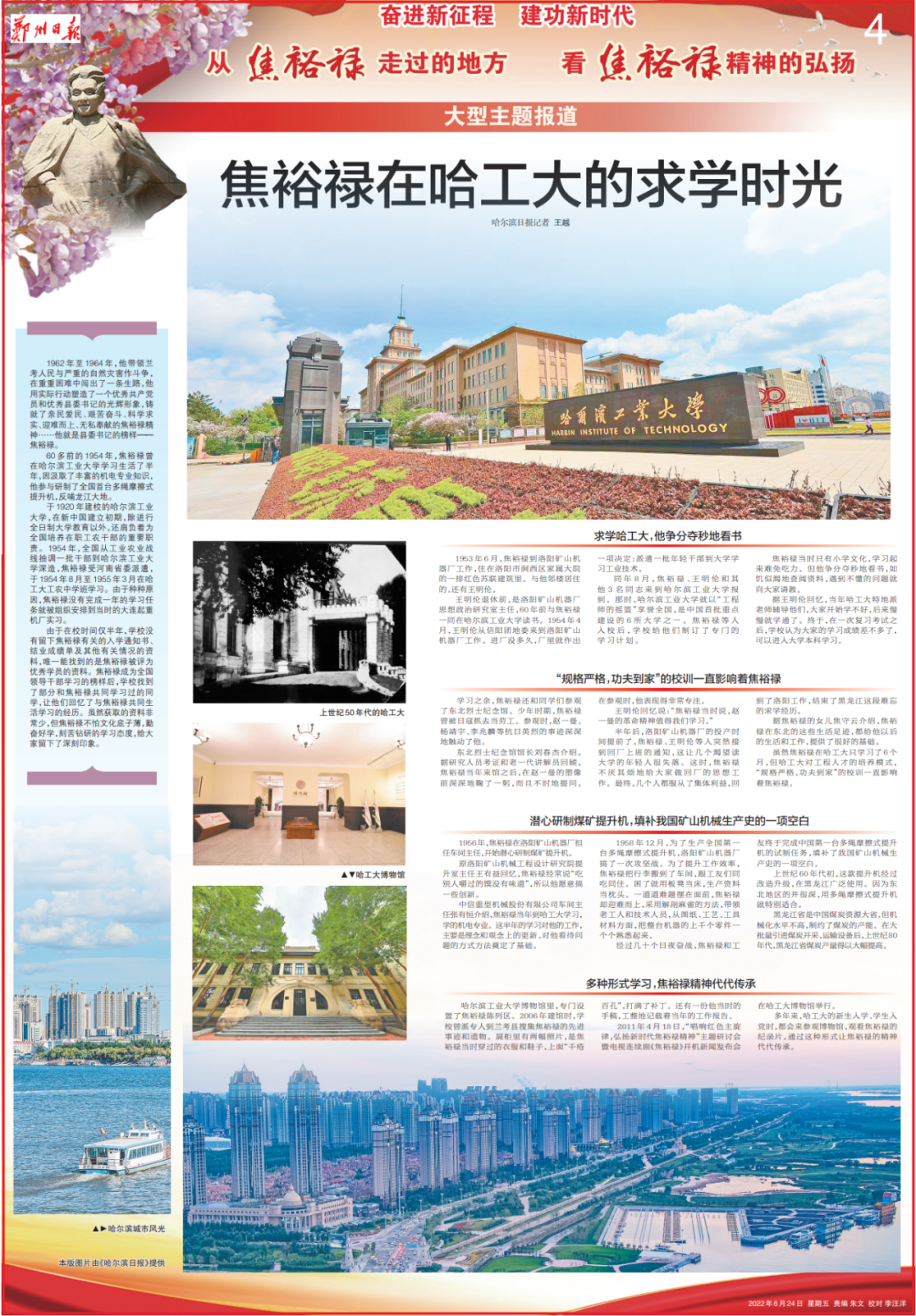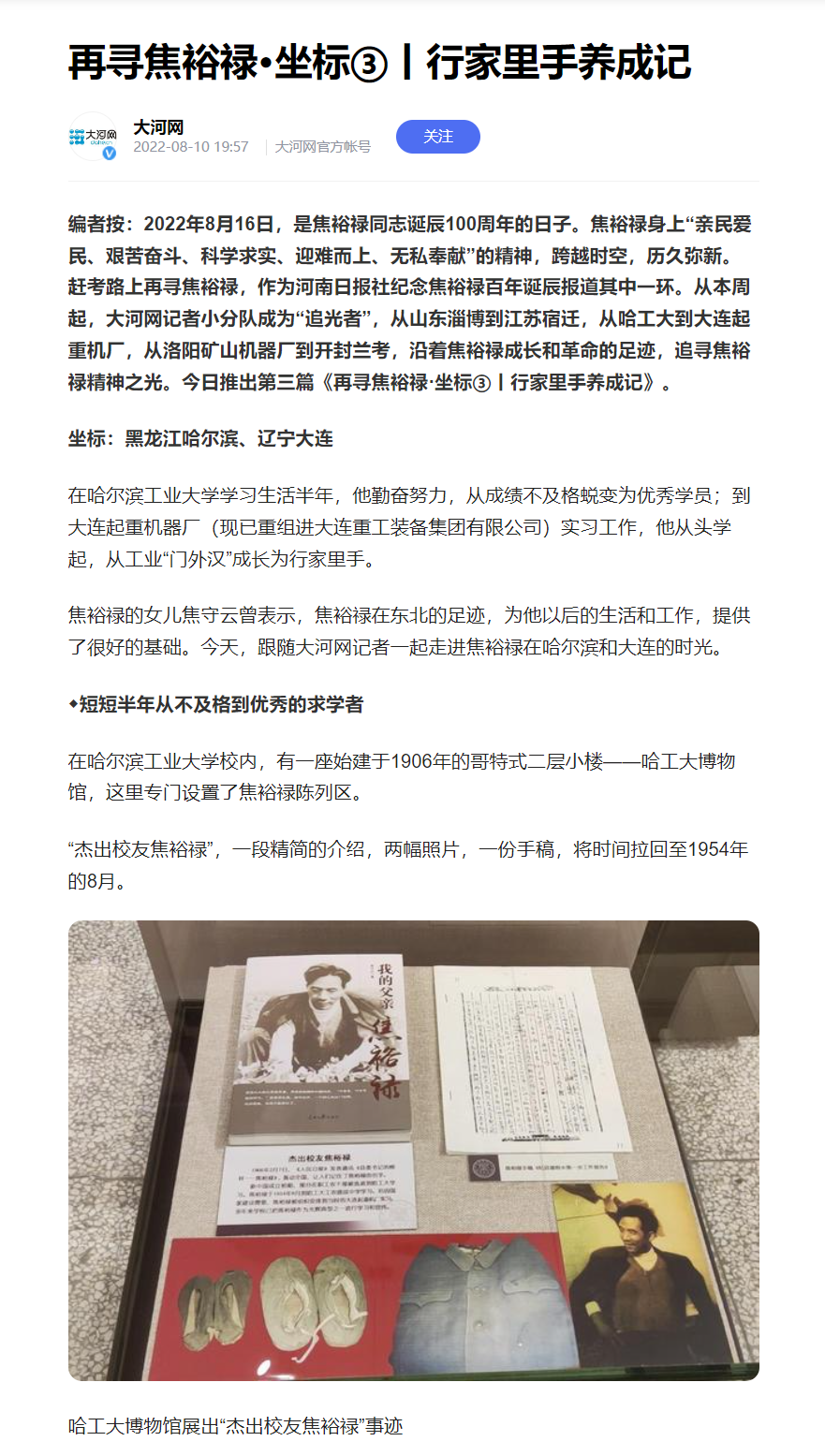 “一提起父亲,大家了解最多的是他在兰考任县委书记的事迹,其实父亲曾在洛阳矿山机器厂工作9年,其间曾来哈工大读书。他善于钻研,是一名优秀的工业技术人才。”置身于哈工大博物馆焦裕禄专题展,焦守云饱含深情地说道。