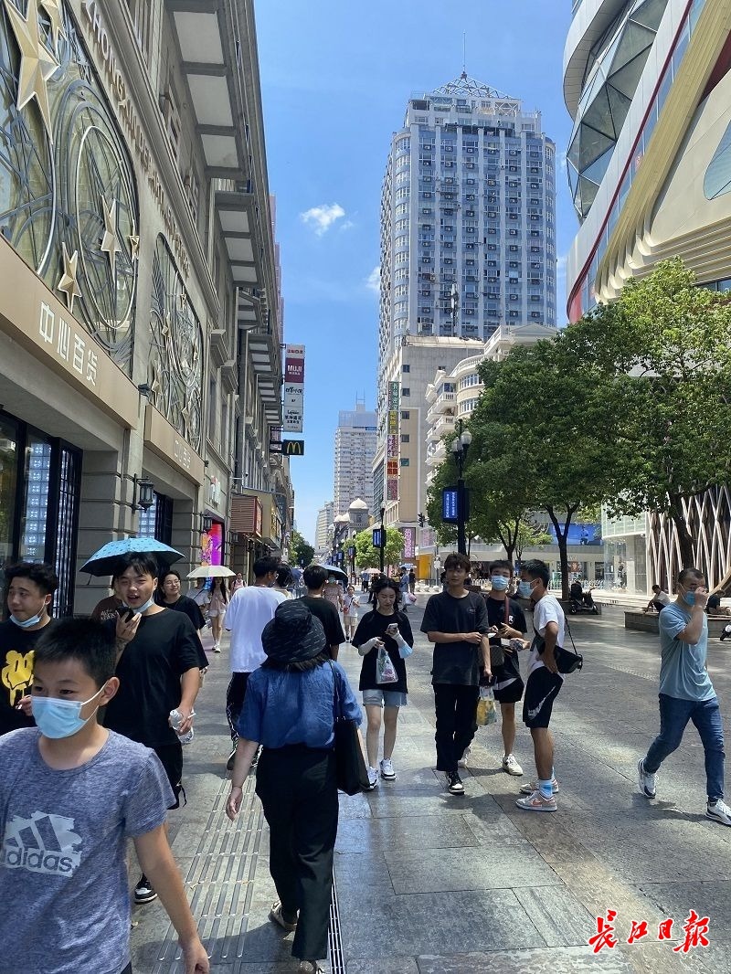 大中午,江汉路步行街上,溜达的年轻人和游客络绎不绝,正应了一句:“我在江汉路等你,热也不散。”