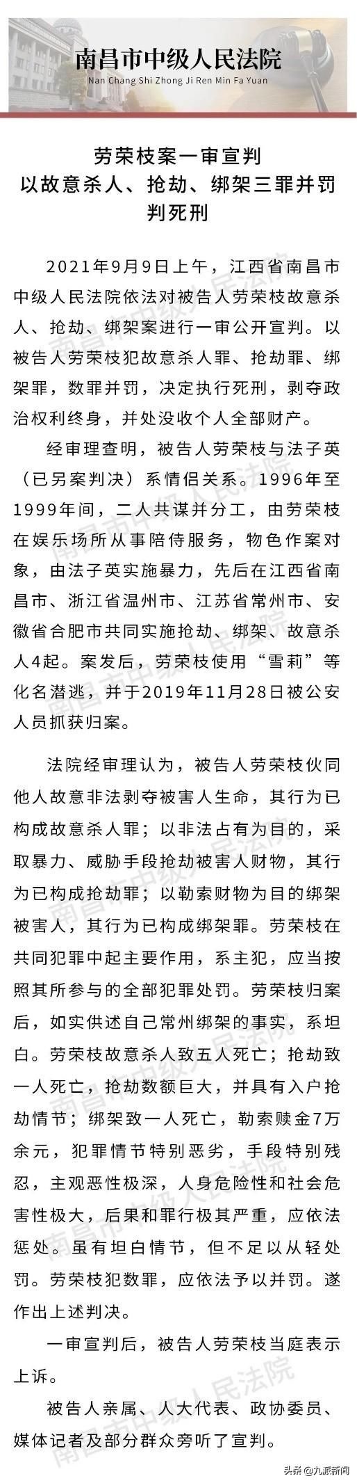 南昌中院经审理认定,被告人劳荣枝犯故意杀人罪、抢劫罪、绑架罪,数罪并罚,决定执行死刑。劳荣枝不服判决,当庭提出上诉。