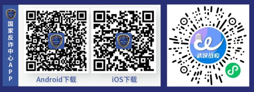 为进一步加强电信网络诈骗宣防工作,切实维护校园平安稳定。请扫描以下二维码,下载“国家反诈中心”APP,同时关注“武汉战疫”小程序反诈专区,学习防范电信诈骗犯罪的相关知识,提升防诈识骗意识和能力。