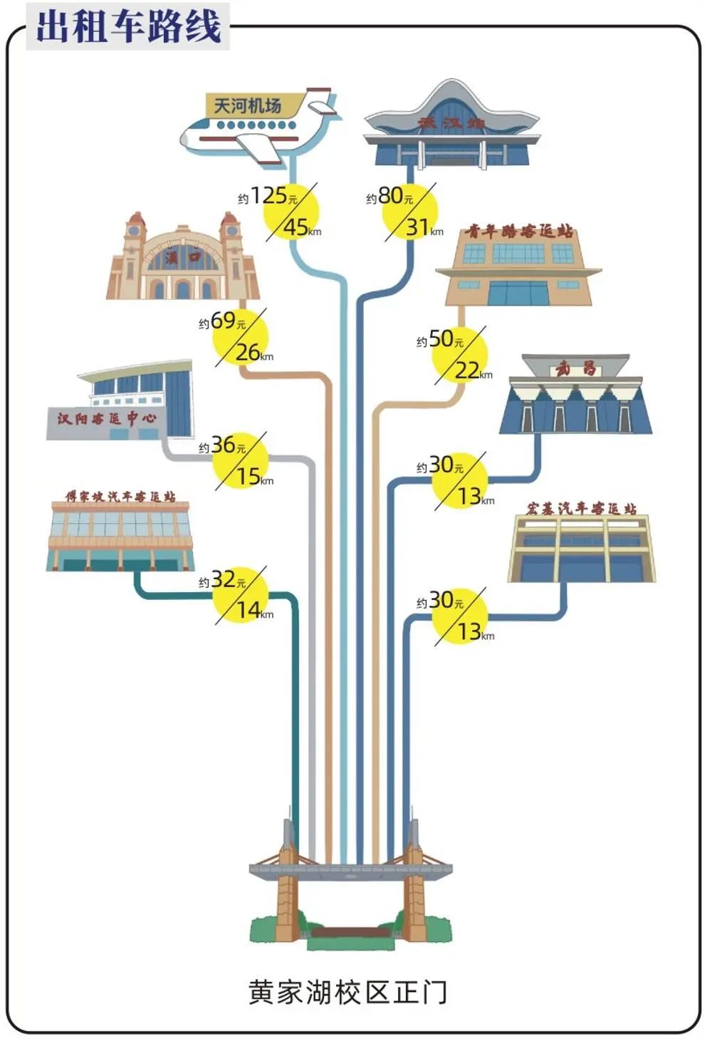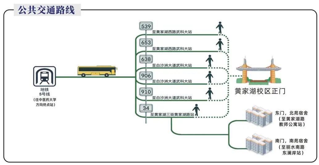 新生到武汉后可参考以下交通路线来校报到(黄家湖校区)。