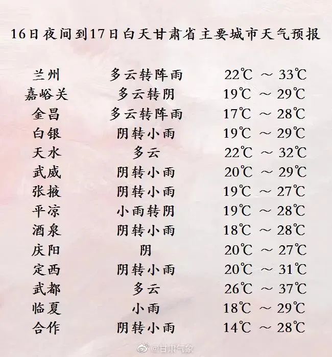 明天夜间到后天白天,临夏、定西、白银、兰州等州市及庆阳市北部阴有中雨,局部地方有大到暴雨;武威、金昌、甘南、陇南、天水、平凉等市州及庆阳市南部、张掖市东部阴有小雨或阵雨,部分地方有中雨;省内其余地方多云,局部地方阴有小雨或阵雨。