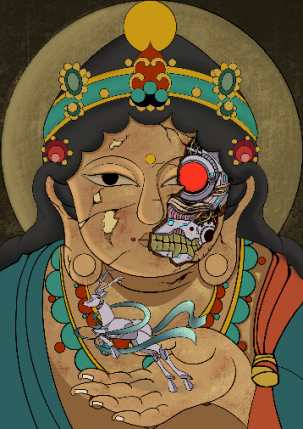当古老的敦煌元素与现代流行元素赛博朋克相相遇,当充满科幻色彩的未来科技感与玄妙神秘的敦煌飞天联动,碰撞产生了奇妙的火花。飞天实践团用传统形象与现代元素的糅合来表现冲突,用朋克插画风与强对比的色彩张力来表现力量,打造出属于这个时代的敦煌飞天。