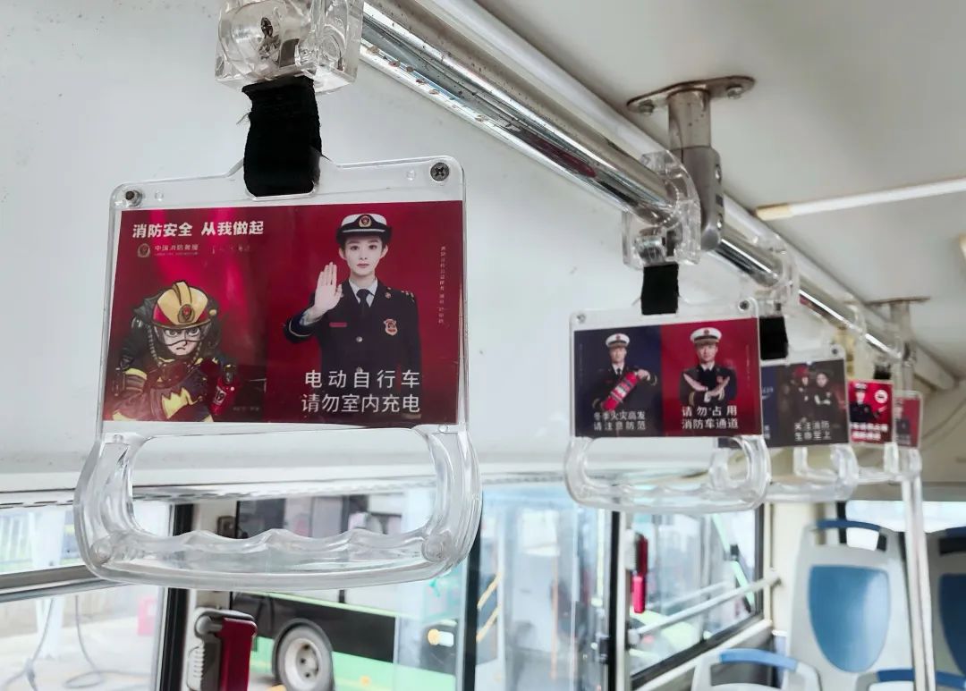 车内在驾驶员后背看板有常用灭火器使用方法、消火栓使用方法、居民防火十法等内容,车内拉手有赵丽颖的“停车请勿占用消防通道”“厨房动火不离人”、“电动自行车切勿室内充电”等等内容;在公交车站台广告主要有“电动车起火 夺命只需100秒”,“消防安全 人人有责”,“报警争分夺秒”,“增强防火意识 掌握逃生常识”,“防范电动车火灾从你我做起”,“乱扔烟头 火患无穷”等等;