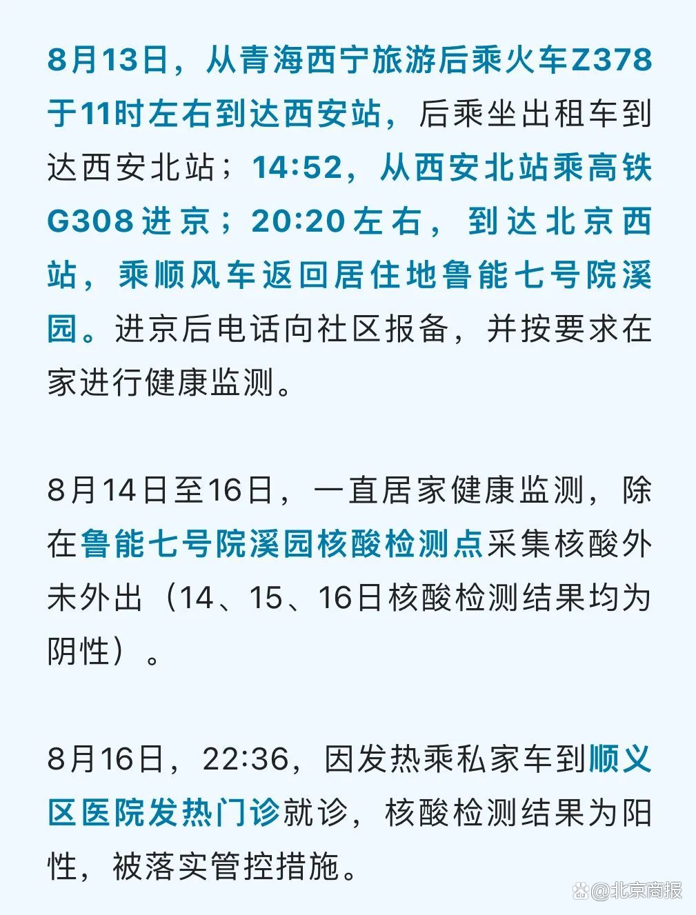 凡与上述行程有时空交集或接到健康宝弹窗提示的人员,请立即主动向社区(村)和单位报告。属地全力做好服务保障工作。