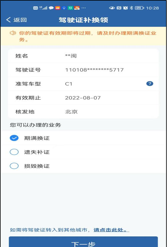 第二步,勾选“期满换证”,阅读业务须知,确认驾驶人信息。(对于不存在有效驾驶证照片的,按照系统提示引导,在线提交驾驶证照片后继续办理。)