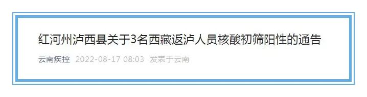 2022年8月15日,泸西县对西藏返泸重点管控人员进行核酸检测时,发现3名初筛阳性人员。现将有关情况通告如下: