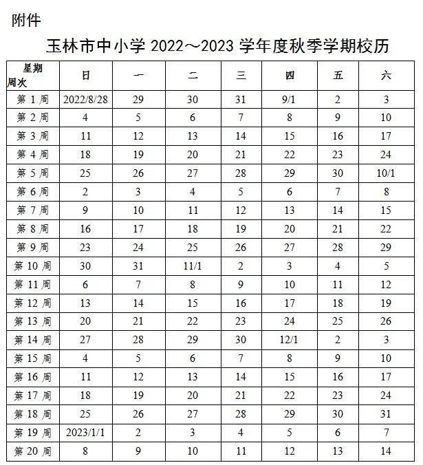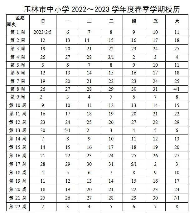 6月17日,玉林市教育局印发《全市中小学2022~2023学年度校历》(以下简称《校历》,明确了玉林市中小学校2022~2023学年校历(幼儿园、中职学校参照执行)。以下是通知全文: