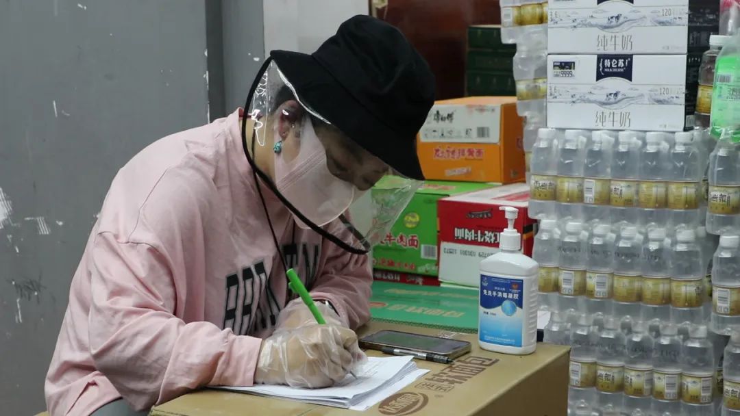 社会志愿团体组织者王菁正在记录入库爱心物资。