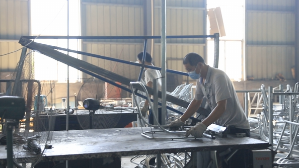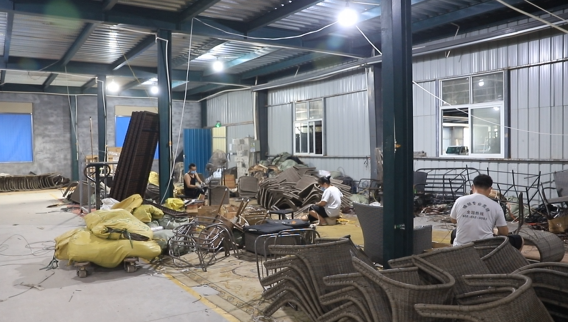 在曹县融悦家具有限公司焊接车间又是一番景象,一边是工人正在熟练的拿着焊枪,焊接藤椅架,另一边工人们正在编织藤椅。镜头里正在生产的藤椅,出口到美国一个要470多美金,工人们编织一个工钱就能得到100多元。