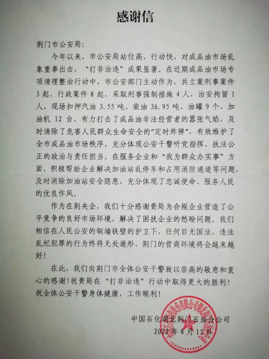 “公安机关为合规企业营造了公平竞争的良好市场环境,解决了困扰企业的愁盼问题。我们相信在人民公安的铜墙铁壁的护卫下,任何目无国法,违法乱纪犯罪的行为终将无所遁形,荆门的营商环境会越来越好!” 中石化荆门石油分公司感谢信中的这段话既是肯定,更是公安机关的责任和动力。