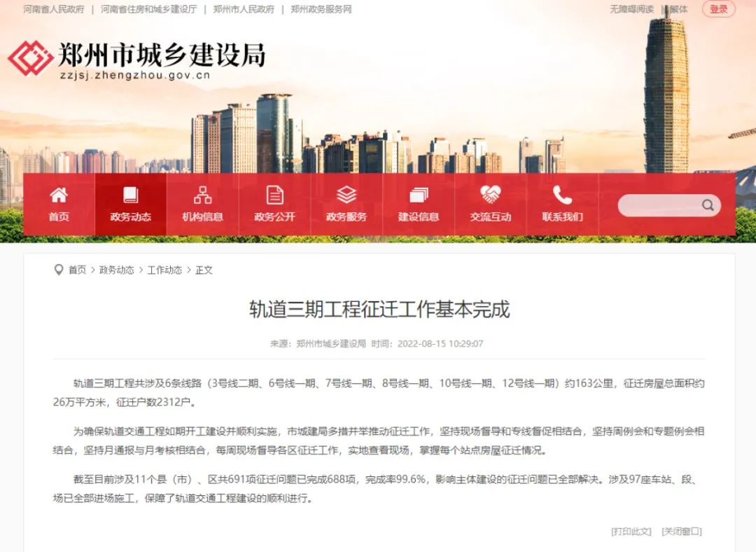 8月15日,郑州市城乡建设局发布《轨道三期工程征迁工作基本完成》,轨道三期工程共涉及6条线路(3号线二期、6号线一期、7号线一期、8号线一期、10号线一期、12号线一期)约163公里,征迁房屋总面积约26万平方米,征迁户数2312户。