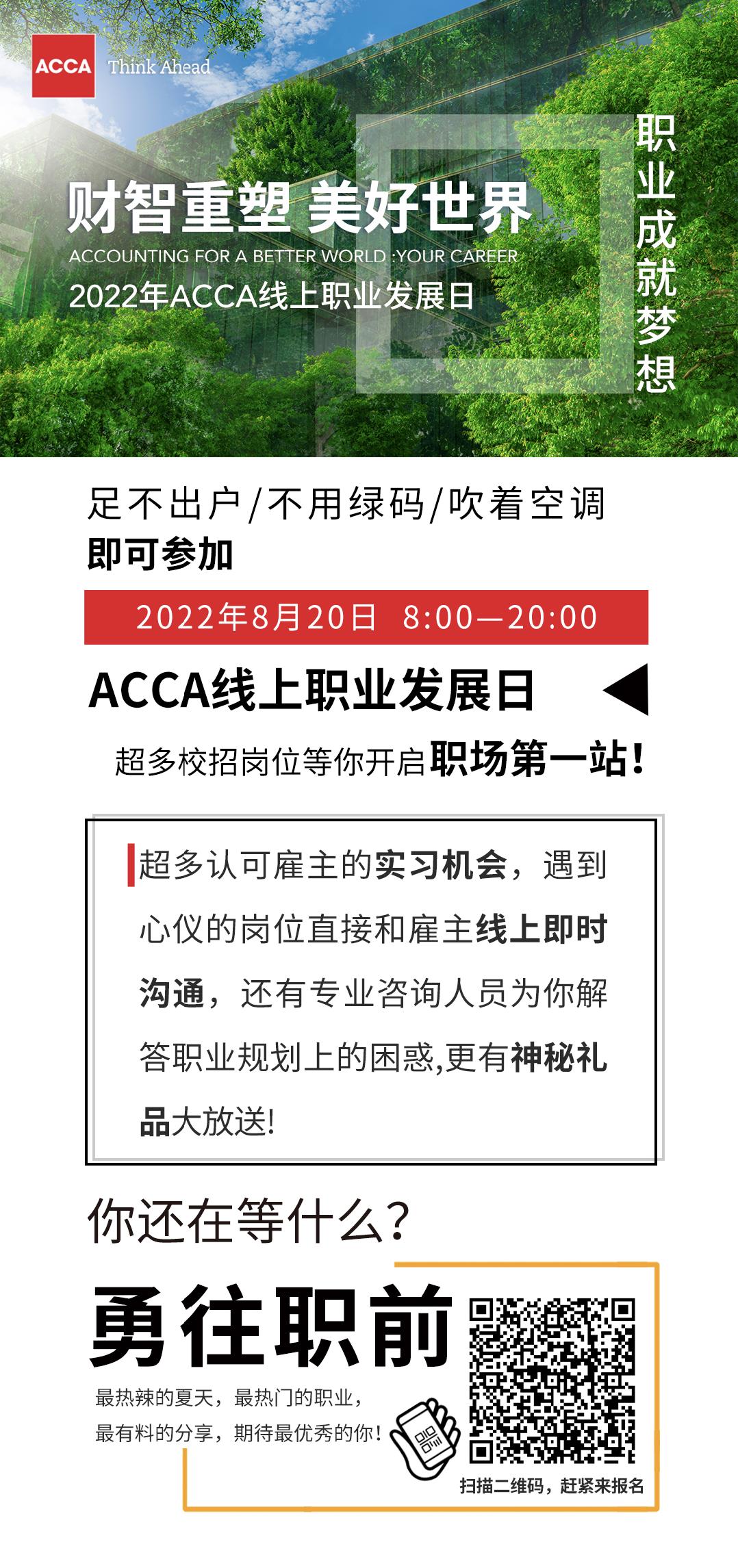 经观第三届融媒体作品大赛的合作伙伴ACCA于本周六8月20日上午8:00-至晚上20:00召开2022年线上职业发展日活动,为本次大赛参赛同学提供更多的实习就业机会,其中很多个岗位和部分企业的管培生项目都不限专业背景,求职技巧、职业规划,全天内容精彩不断!欢迎大家参加!欢迎大家参加!