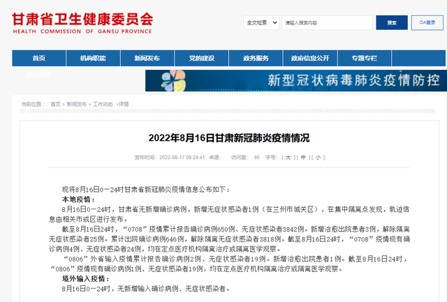 现将8月16日0—24时甘肃省新冠肺炎疫情信息公布如下: