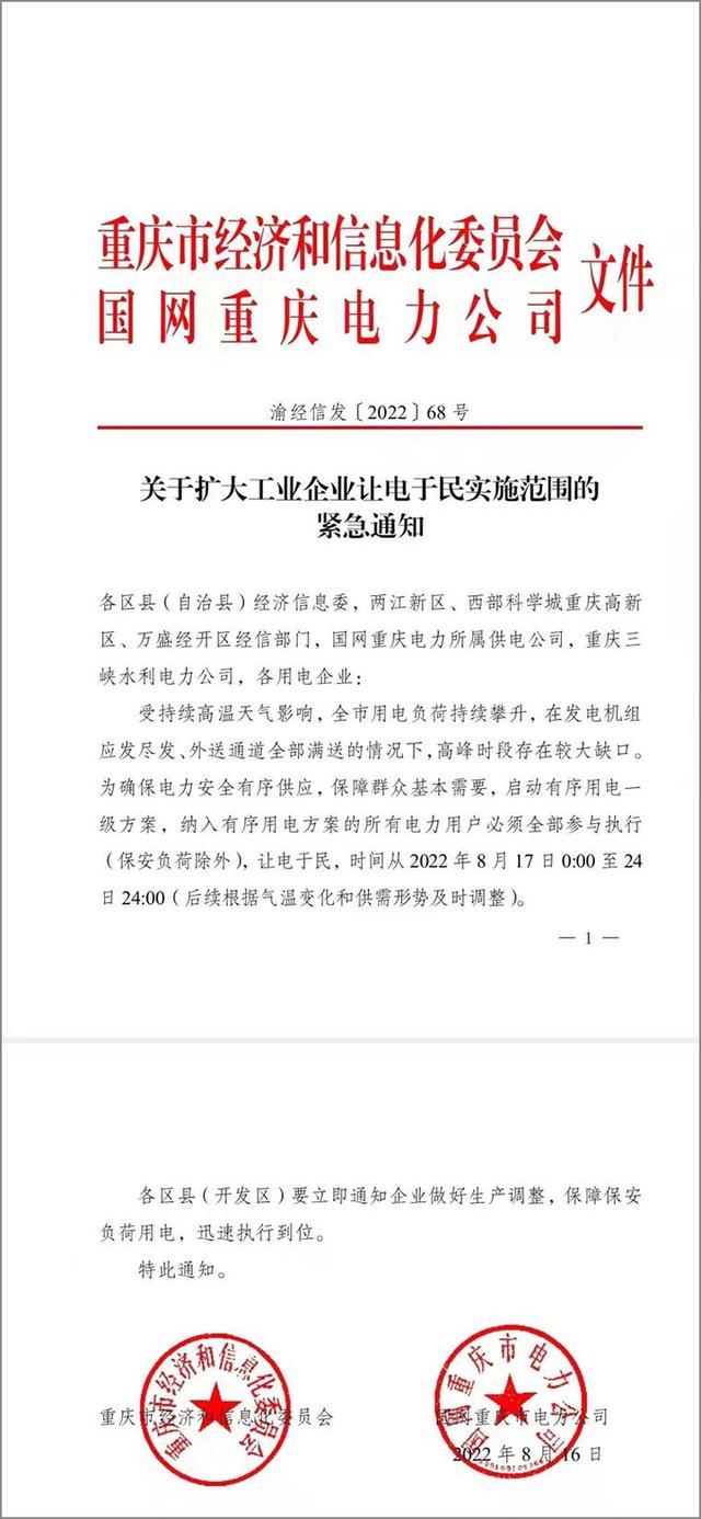 8月16日,重庆市经济和信息化委员会与国网重庆电力公司联合下发《关于扩大工业企业让电于民实施范围的紧急通知》。为确保电力安全有序供应,保障群众基本需要,启动有序用电一级方案,纳入有序用电方案的所有电力用户必须全部参与执行(保安负荷除外),让电于民,时间为8月17日0:00-8月24日24:00,后续根据气温变化和供需形势及时调整。