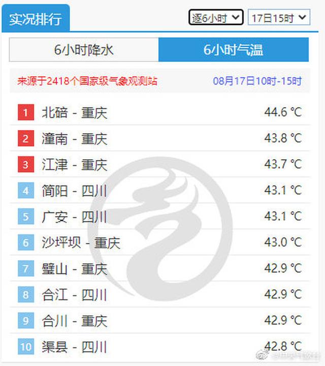@中央气象台 8月17日消息,川渝高温领跑全国。8月17日14:10左右,重庆北碚站最高气温达44.6℃,刷新当地最高气温极值纪录,距离上一次这个纪录被打破仅过去两天(8月14日);代表重庆的沙坪坝站14:39的气温已升至43℃,追平了重庆最高气温极值纪录(此前最高气温纪录是2006年8月15日的43℃)。