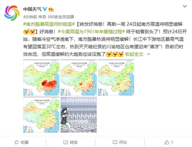 不过,终于能看到头了!据@中国天气消息,预计8月24日开始,随着冷空气渗透南下,南方酷暑热浪将明显缓解。
