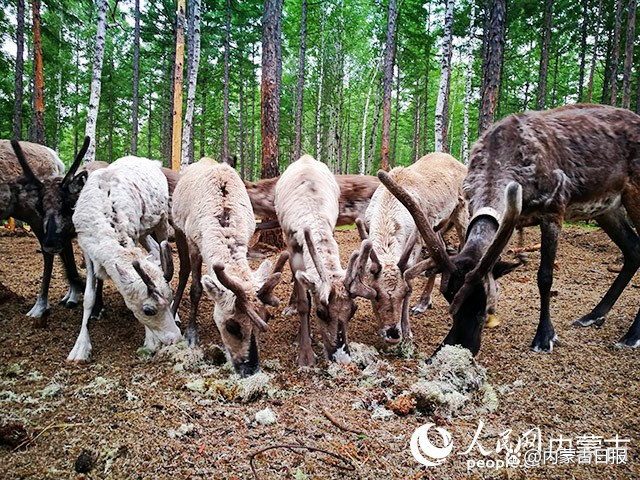 引进驯鹿与本土驯鹿一同进食。张旭摄