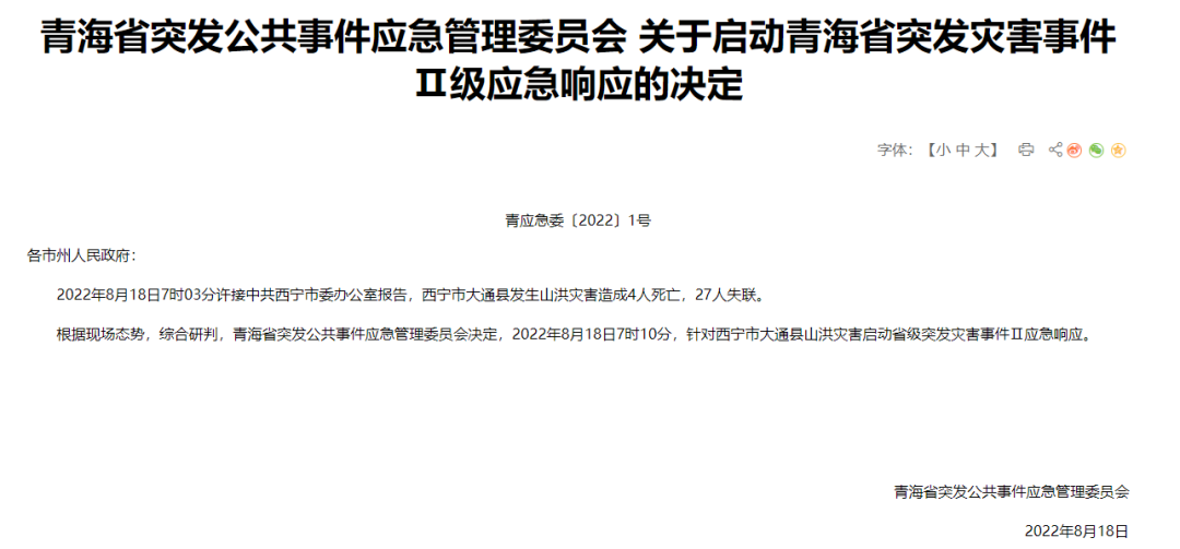 根据现场态势,综合研判,青海省突发公共事件应急管理委员会决定,8月18日7时10分,针对西宁市大通县山洪灾害启动省级突发灾害事件Ⅱ级应急响应。