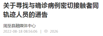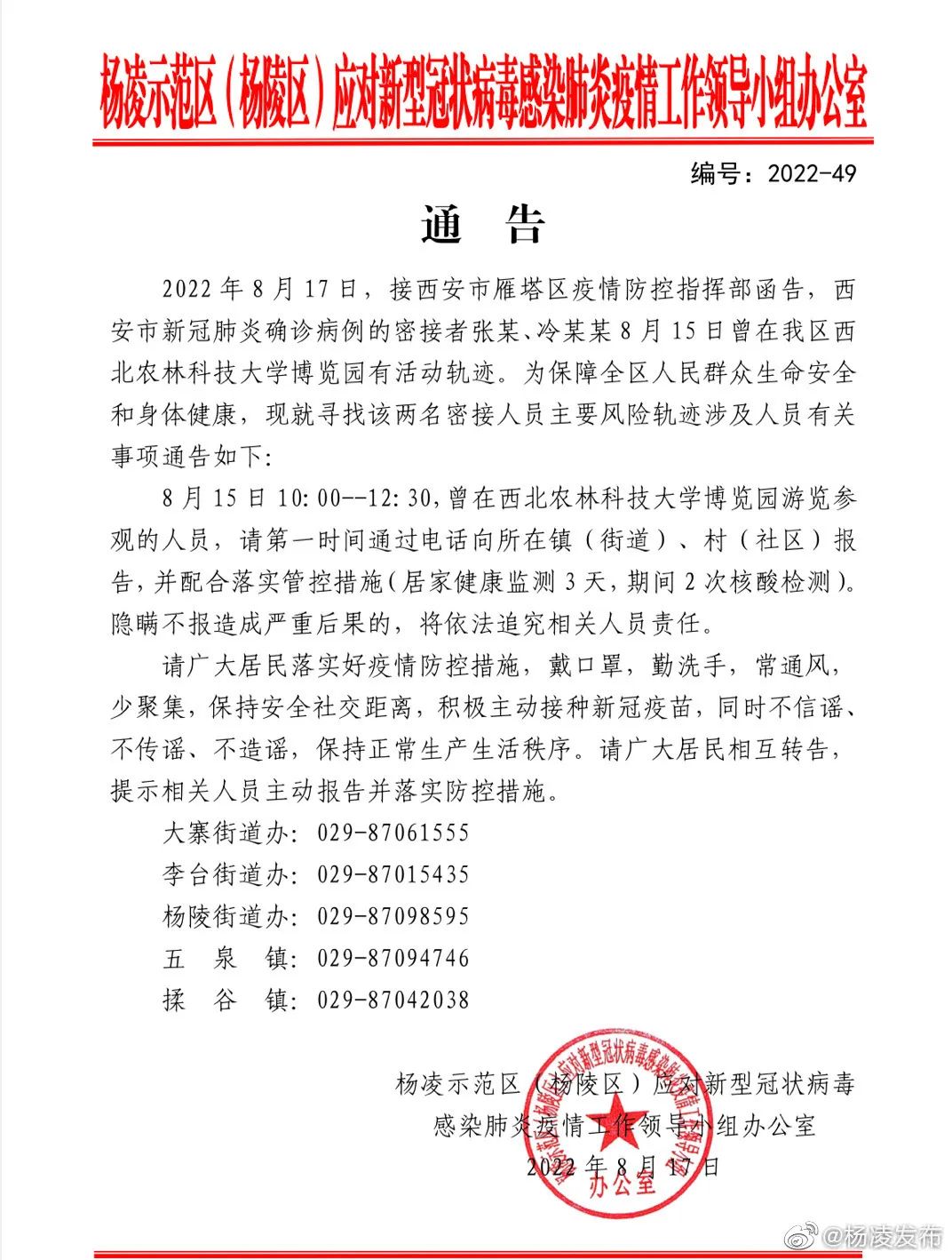 杨凌示范区(杨陵区)应对新型冠状病毒感染肺炎疫情工作领导小组办公室发布2022-49号通告,寻找与密接者同轨迹人员。全文如下