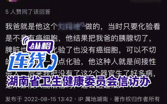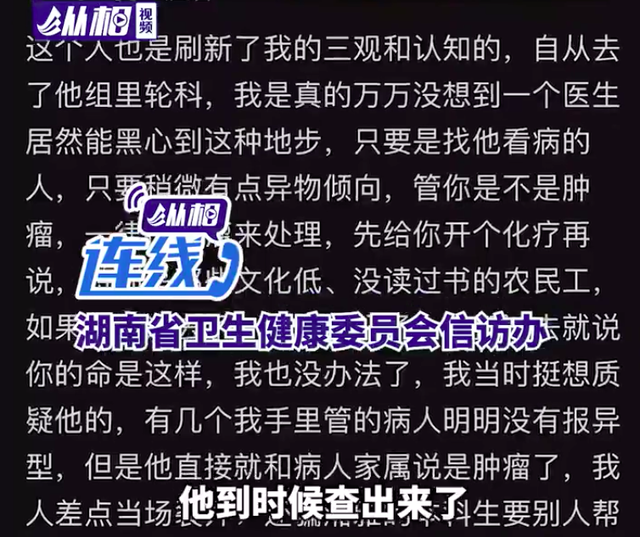 18日,东方网·纵相视频致电湘雅二院医疗作风建设办公室了解到,该医生已停职,正在接受调查。湖南省卫生健康委员会信访办工作人员表示,相关部门已对该名医生进行调查,调查结果“到时候会有一个交代”。