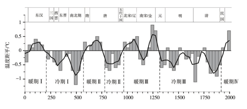 后来的学者又进一步将我国秦汉以来的历史以百年尺度,分为暖冷交替的7个时期,包括秦汉暖期、魏晋南北朝冷期、隋唐暖期、唐末五代冷期、宋元暖期、明清冷期和20世纪暖期。在每一个大的冷暖期中还存在次一级的冷暖波动。