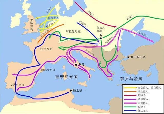 其实不止古代中国,放眼世界,气候变迁的影响也是显著同步的,在寒冷期,北方游牧民族被迫南移是一个全球普遍的问题,在中国魏晋南北朝冷期,汉帝国瓦解,五胡十六国乱成一团,同一时期,匈奴人、突厥人通过欧亚腹地一路向西,在欧洲,撒克逊人、法兰克人、哥特人、汪达尔人、伦巴底人等蛮族入侵,毁灭了东罗马帝国。