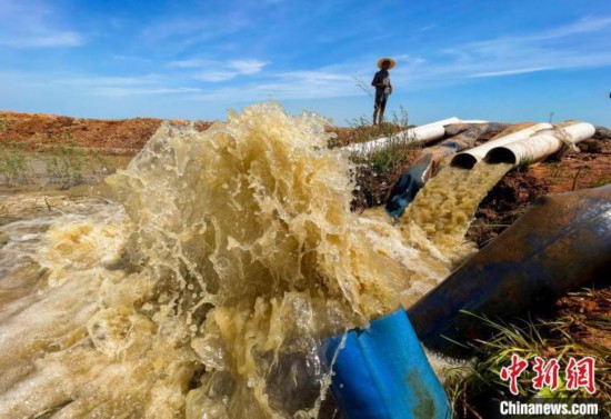 江西省九江市都昌县周溪镇枭阳10号附坝,抽水泵在鄱阳湖取水,经过三级提灌,为坝内五千亩稻田灌溉保苗。 傅建斌 摄