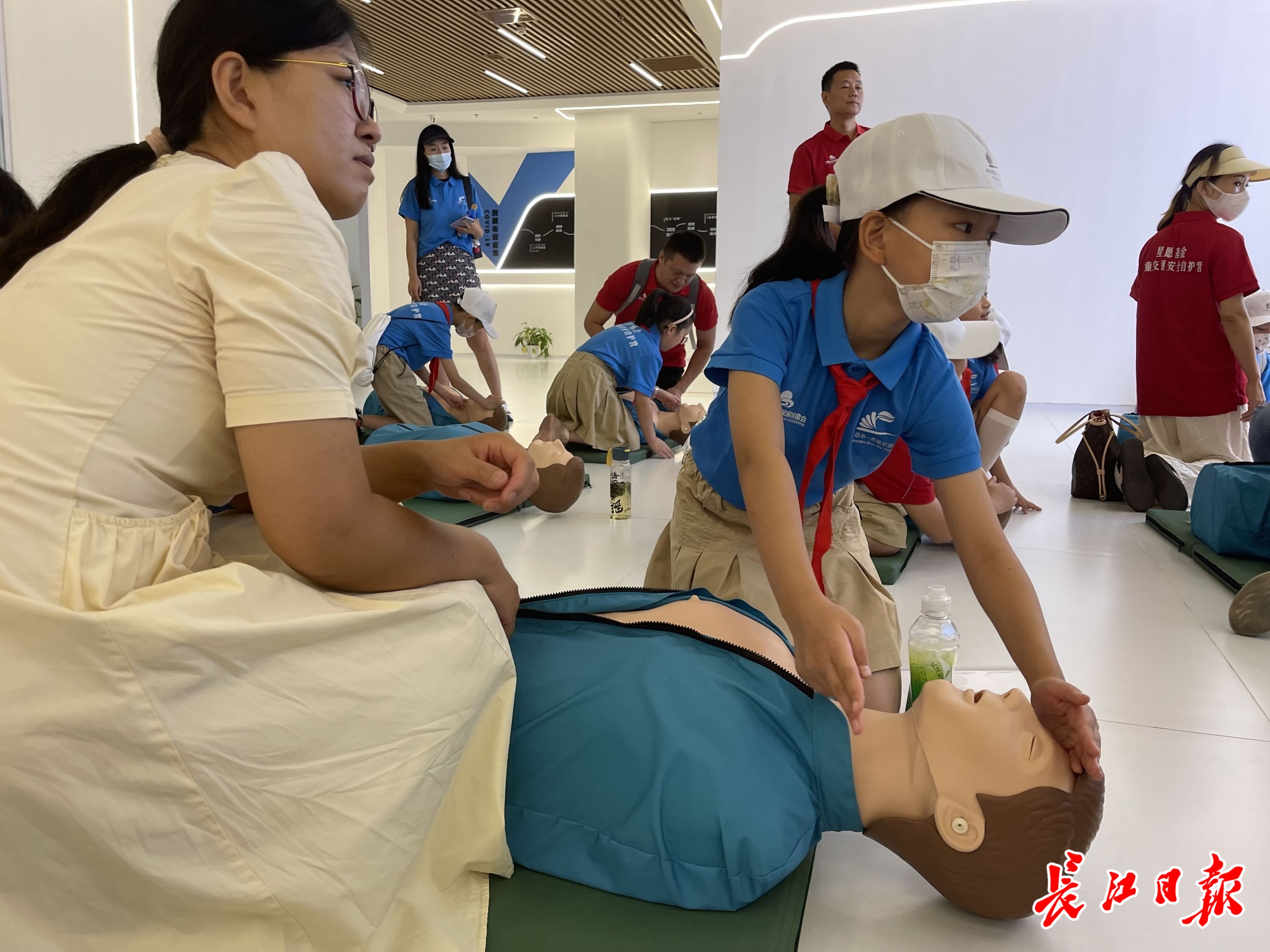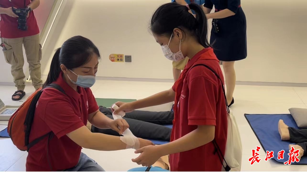 在公共卫生区的心肺复苏与急救中心,在工作人员的讲解和示范下,孩子和家长们还学习了伤口包扎和三角巾包扎。
