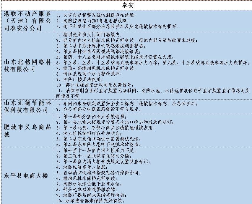 齐鲁网·闪电新闻8月18日讯 为深入推进消防安全大检查工作,进一步净化全省消防安全环境,促进单位落实消防安全主体责任,加快火灾隐患和消防安全违法行为整改,现对存在火灾隐患和消防安全违法行为的80家单位进行曝光,其中泰安5家。