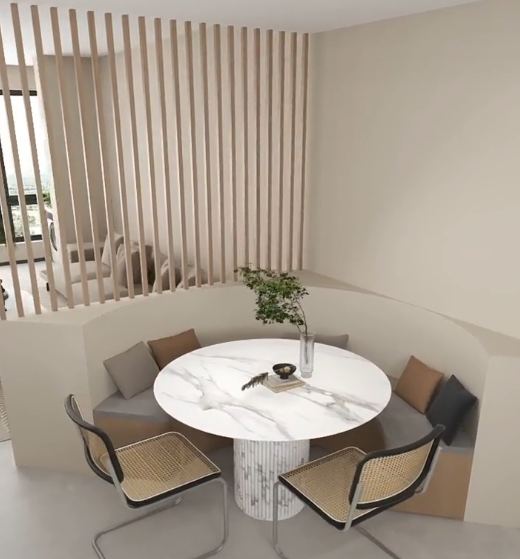 在客厅旁边做圆形餐厅设计,并且还能起到分割客厅和餐厅的效果。从之前的四人餐桌设计改成了圆形,足以容纳六人使用了。