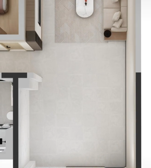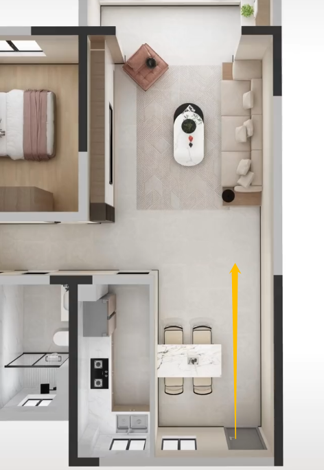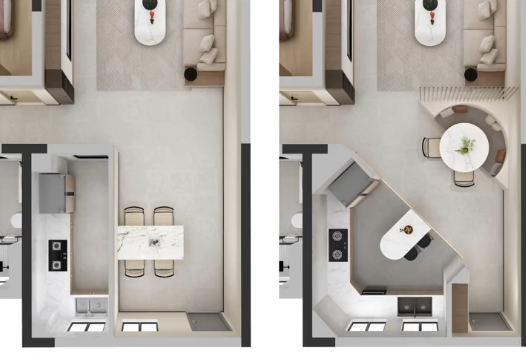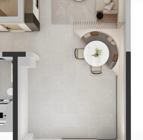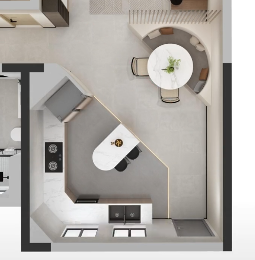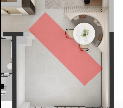 其次就是做成这样圆弧的餐厅以后,我们就不能按照常规的方式分割墙来做厨房了,粉色位置为空间流出的过道位置。