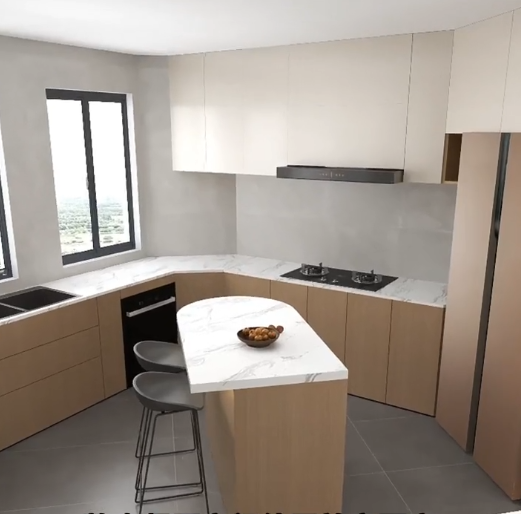 沿着过道做斜墙做厨房,这样的厨房空间从原有的小L厨房变成大三角厨房。空间不是大了一点点。