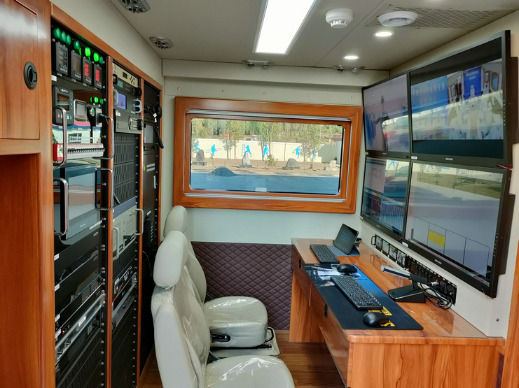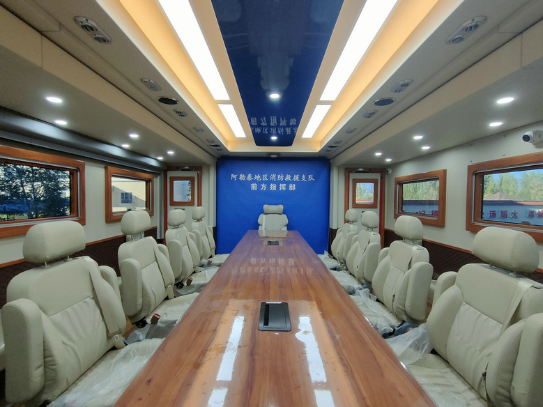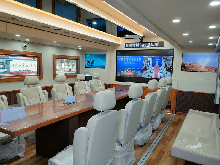 “动中通”卫星通信指挥车采用国产双桥底盘,定制侧拉扩展方舱,扩展后变为25㎡左右的会议室,可容纳20余人。车内包括“动中通”卫星通信系统、消防指挥调度平台系统、视频处理系统、网络办公系统、4G\5G聚合路由通信系统、天通多链路对讲系统、广播音响系统和集中控制系统,采用超静音柴油发电机、UPS不间断电源系统和外接两相三相电相结合的供电方式,具有在火场及其他灾害事故现场和消防勤务现场进行通信组网、指挥通信、情报信息支持等功能。