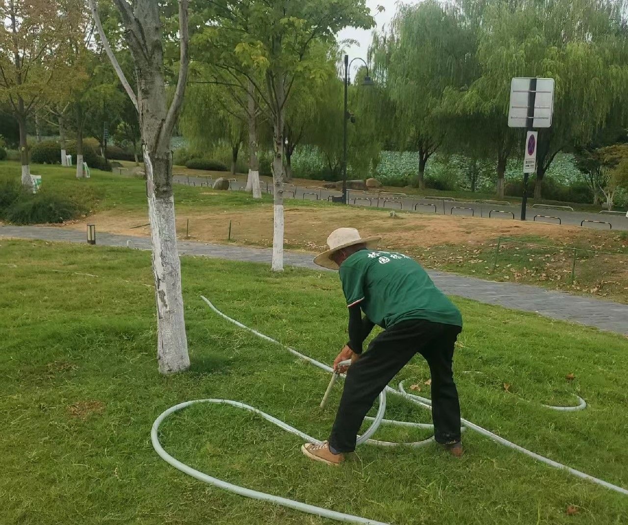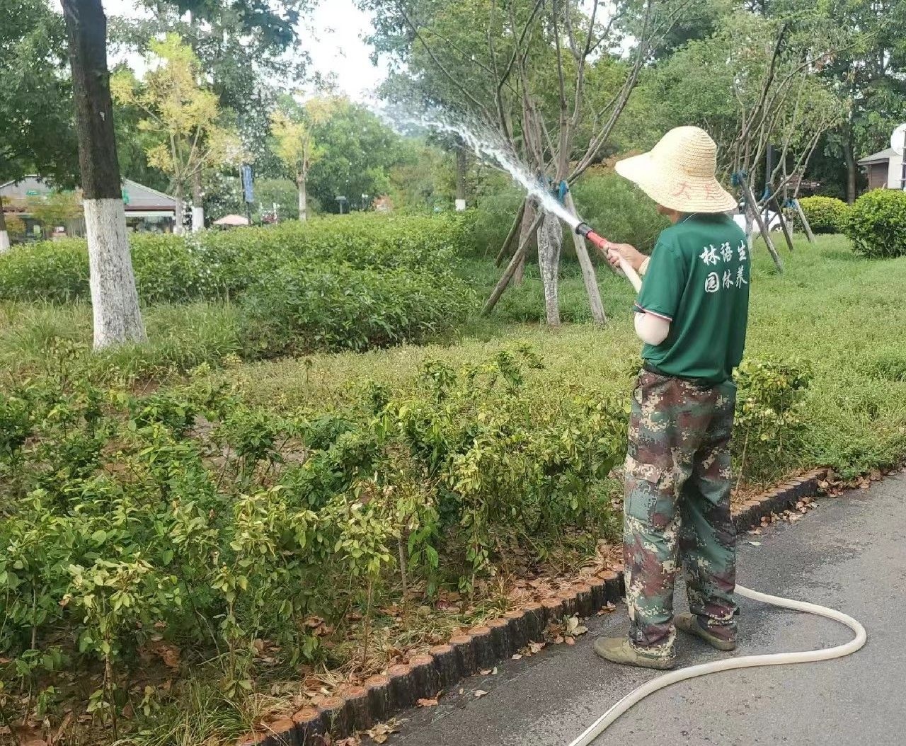 除了“水袋子”“打吊瓶”,园林工人们在园区针对草坪、花卉、灌木、乔木、新老树苗的不同特点,分别采取了水车浇水、自动喷淋、水袋滴灌以及360度高压水炮等“补水神器”,让植物“自由喝水”。“对喜阴植物及新种小苗加盖遮荫网,对种植在绿地中的树木树穴松土,对高大的树使用水雾喷洒,滋润叶面,因地制宜保证苗木顺利度过高温。”郭陆军介绍道。
