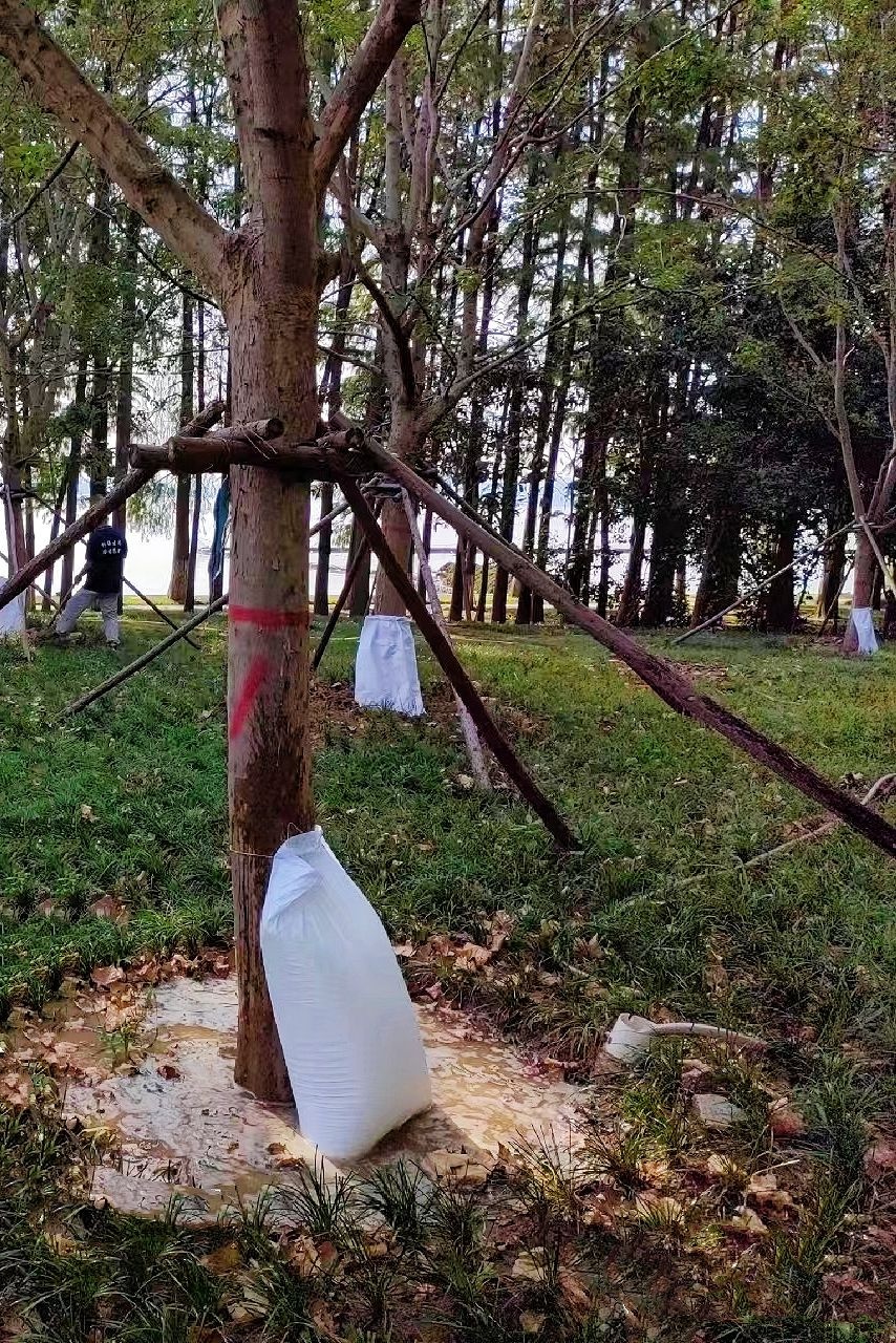 东湖听涛寓言园,每棵树都“抱”着一个水袋。