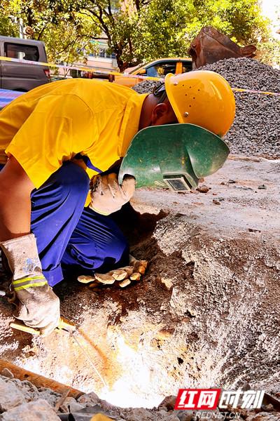 此时正是14时30分。长沙新奥燃气有限公司河西管网运行组抢修员欧志强正拿着防护面罩和电焊枪,在科教新村9栋旁开挖好的旱沟里,开始抢修工作。施工现场虽在楼体的阴凉处,但热浪无处可躲。汗水像冒泡一样从施工人员的毛孔里冒出来,焊个三五下,他们就要拿毛巾擦一擦额头和眉眼上的汗,以免“糊”在眼睛上,遮住了视线。“我们必须抓紧时间,赶在居民做晚餐的用气高峰前,把漏气孔堵上。”