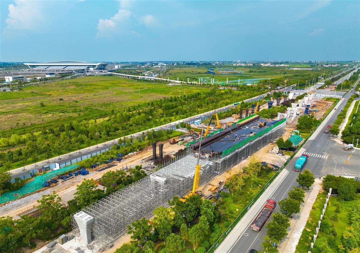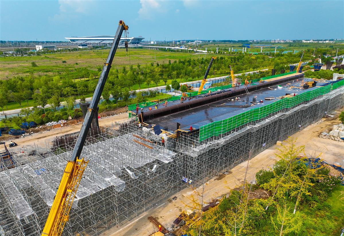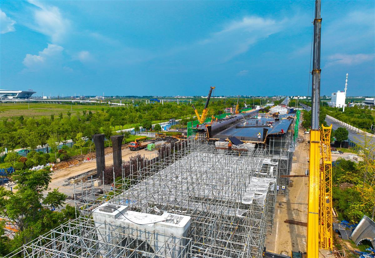 8月17日,襄阳内环提速改造二期,内环至襄阳东站、襄阳机场连接线项目建设现场,工人开展首联现浇连续箱梁施工。该项目总投资10.9亿元,建成后,将使襄阳市区快速路网系统基本形成,内畅外快交通体系基本建立,中心城区实现“半小时交通圈”的出行目标。(湖北日报全媒记者田悦 通讯员谢勇、李健 摄)