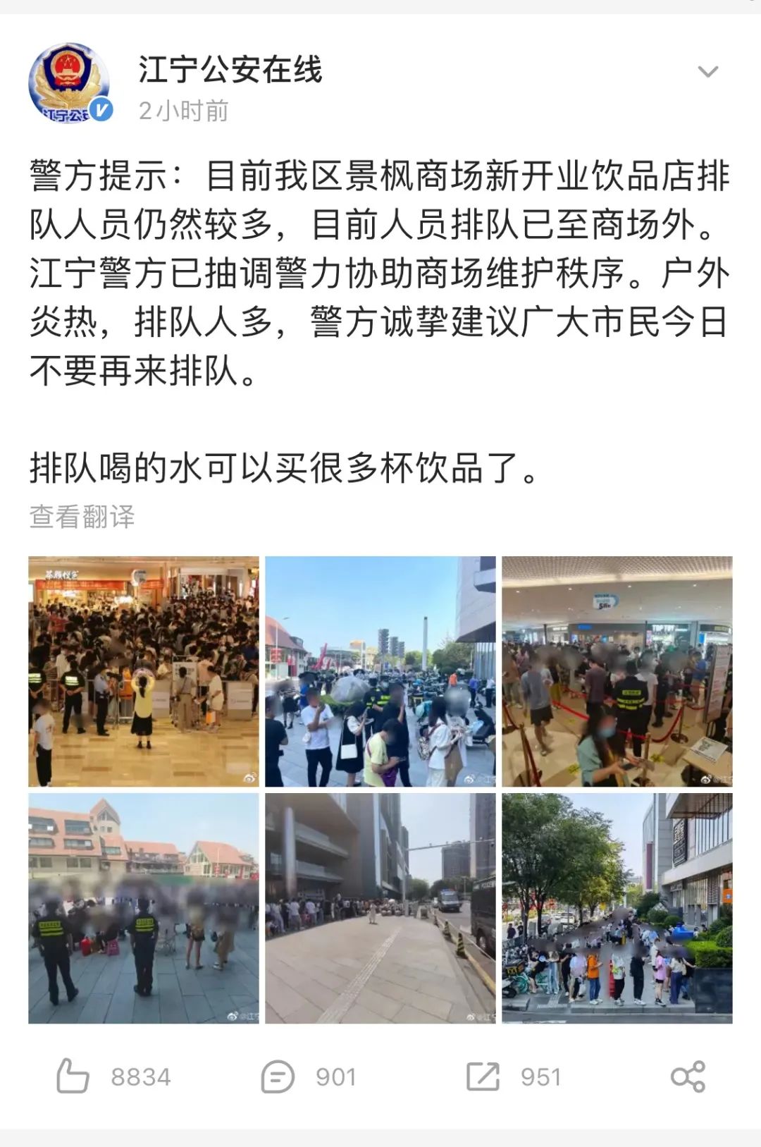 据媒体报道,还在正常营业的江宁景枫店门前,中午时分仍有大量市民顶着酷暑排队购买,据店方估计,目前平均排队时长约需5小时。@江宁公安在线午间已抽调警力协助商场维护秩序,并在微博发布提醒,建议市民今日不要再来排队,“排队喝的水可以买很多杯饮品了”。