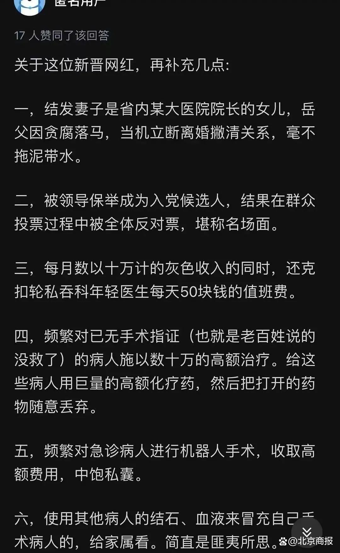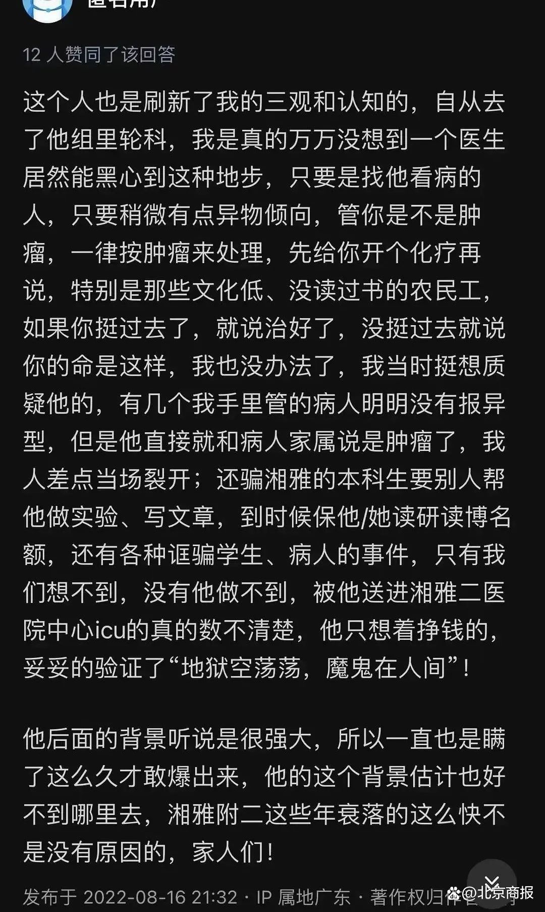 8月17日,有网友反映湖南省长沙市中南大学湘雅二医院一医生医疗作风有问题。比如,机器人做不完全性肠梗阻,开进去找不到梗阻段,就把正常肠管切下来给家属看;只要找他看病,稍微有点异物倾向,先做化疗等,引起广泛关注。