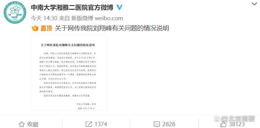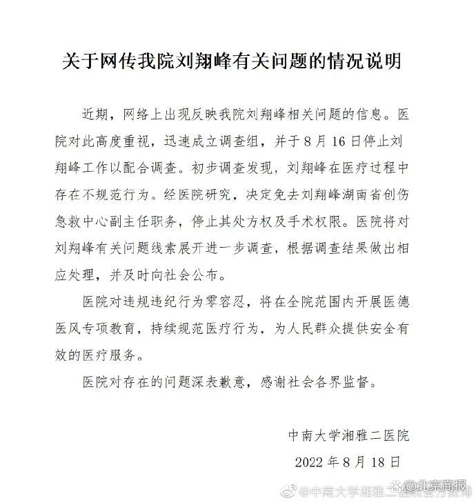 8月18日,中南大学湘雅二医院发布情况说明称:初步调查发现,刘翔峰在医疗过程中存在不规范行为。经医院研究,决定免去刘翔峰湖南省创伤急救中心副主任职务,停止其处方权及手术权限。