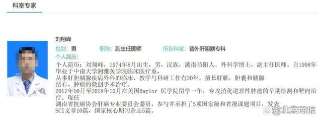 医院官网资料显示,刘翔峰出生于1974年8月,湖南益阳人,外科学博士,副主任医师。自1998年毕业于中南大学湘雅医学院临床医疗系,从事肝胆胰腺疾病外科的临床、教学与科研工作有20年。擅长肝脏、胆囊、胰腺结石和肿瘤的微创手术治疗。2017年10月至2018年10月在美国Baylor医学院留学一年,专攻消化道恶性肿瘤的早期检测和靶向治疗。现任湖南省抗癌协会肝癌专业委员会委员,参与并承担了5项国家级和省级课题项目,发表SCI文章10篇,国家核心期刊杂志5篇。